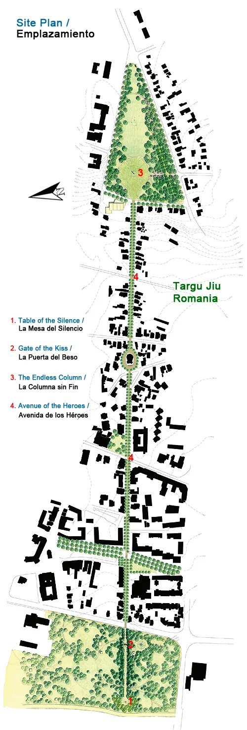 En el año 1934 las Autoridades Locales de Rumanía propusieron a Constantin Brancusi un nuevo monumento con motivo del fallecimiento de los jóvenes soldados rumanos en la Primera Guerra Mundial, quienes habían defendido la ciudad de Targu Jiu de la invasión alemana. Brancusi aceptó el encargo sin pensarlo y se puso enseguida manos a la obra. El ya famoso artista en todo el mundo imaginó un monumento llamado "The Sculptural Ensemble of Constantin Brâncuşi" o "Conjunto Escultórico Constantin Brancusi", (El Ensamble). Este monumento está compuesto por tres esculturas que se sitúan a lo largo de una línea recta en un recorrido de más de 1 km. de longitud denominado "La Avenida de los Héroes": éste, se sitúa perpendicular al río Jiu. La Mesa del Silencio y La Puerta del Beso realizadas en piedra se sitúan en el lado oeste del enorme parque, mientras que La Columna sin Fin de casi 30 metros de altura, se erigió espléndida en su extremo opuesto, al este.